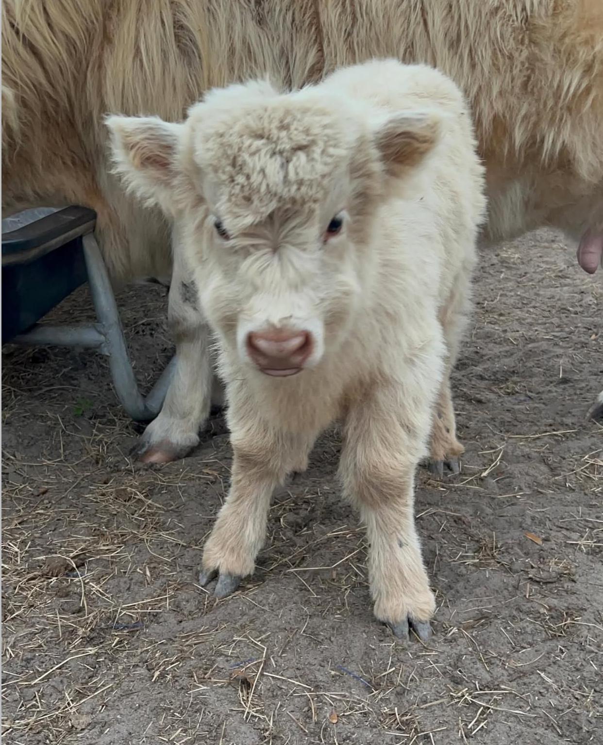 Frosty is full of personality — a fluffy white Mini Highland bull calf with playful energy and a soft disposition. His curly coat glistens under sunlight, and he’s known to trot up to visitors for head scratches. Raised by hand and accustomed to gentle handling, Frosty will make a loyal companion or an excellent breeder bull for small-scale farms.